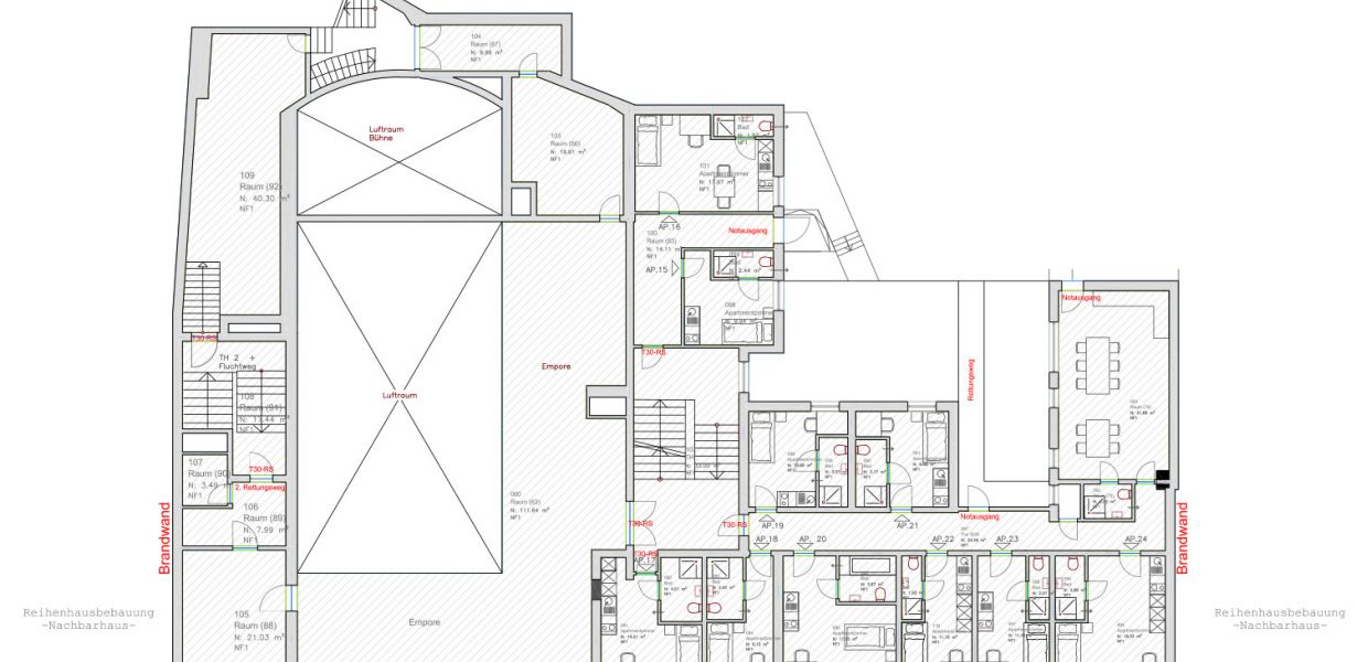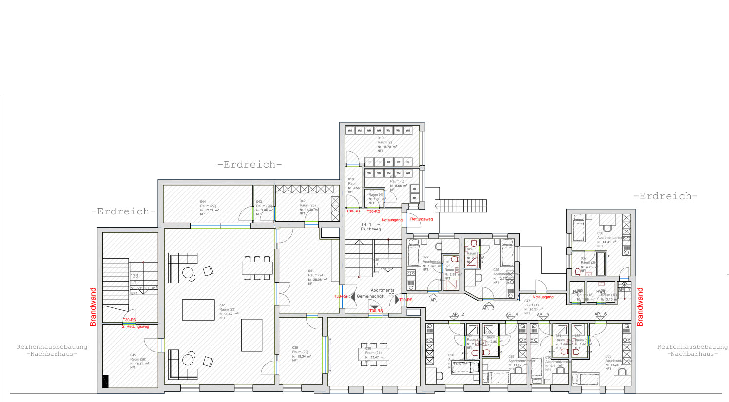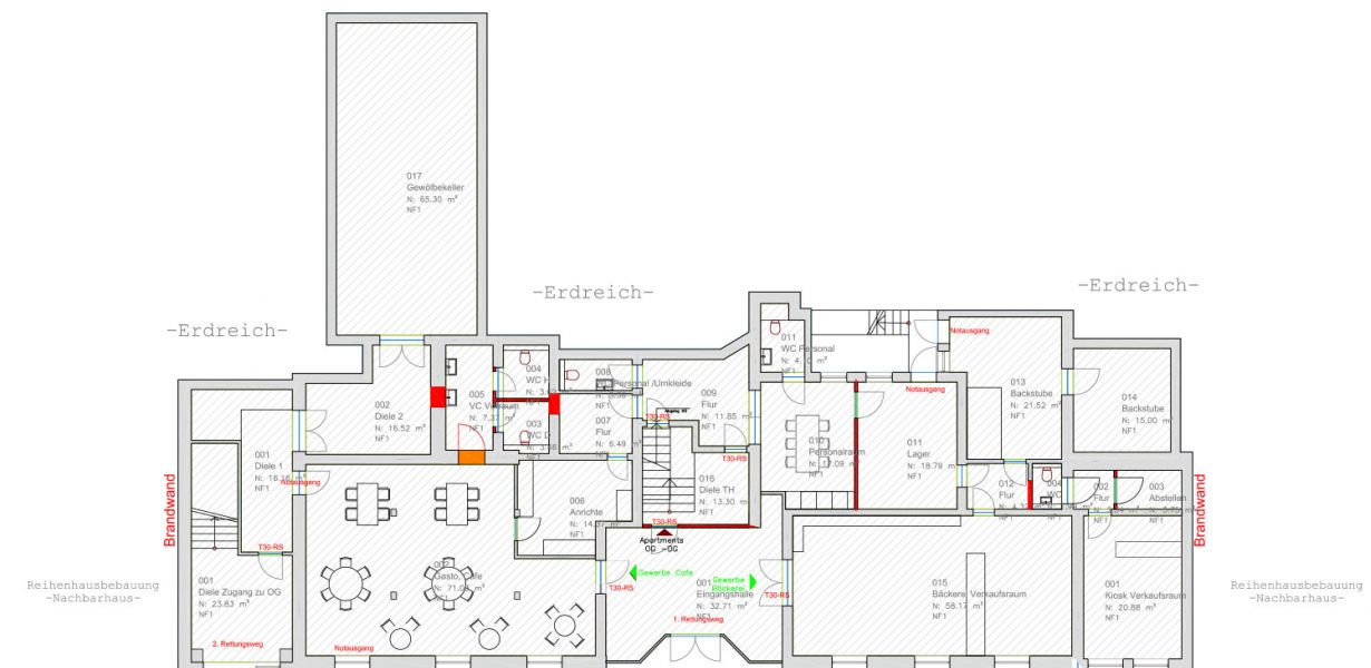 Das Gebäude besteht aus drei verschiedenen Nutzungszonen. Im Erdgeschoß befinden sich ca. 430 qm für die gewerbliche Nutzung. In einem Teil des Gebäudes werden eine Bäckerei mit eigenem Backofen und einem vorgelagerten Verkaufsraum entstehen. Auf dieser Ebene wird auch Platz für ein Café mit Verbindungswegen zur Bäckerei und einer Kapazität von bis zu 40 Personen sein. Brandschutztüren grenzen diesen Bereich baulich von den darüber befindlichen Räumlichkeiten ab. Für das gesamte Gebäude wurde ein Brandschutzkonzept von Experten entwickelt und von den zuständigen Behörden für genehmigungswürdig erachtet.