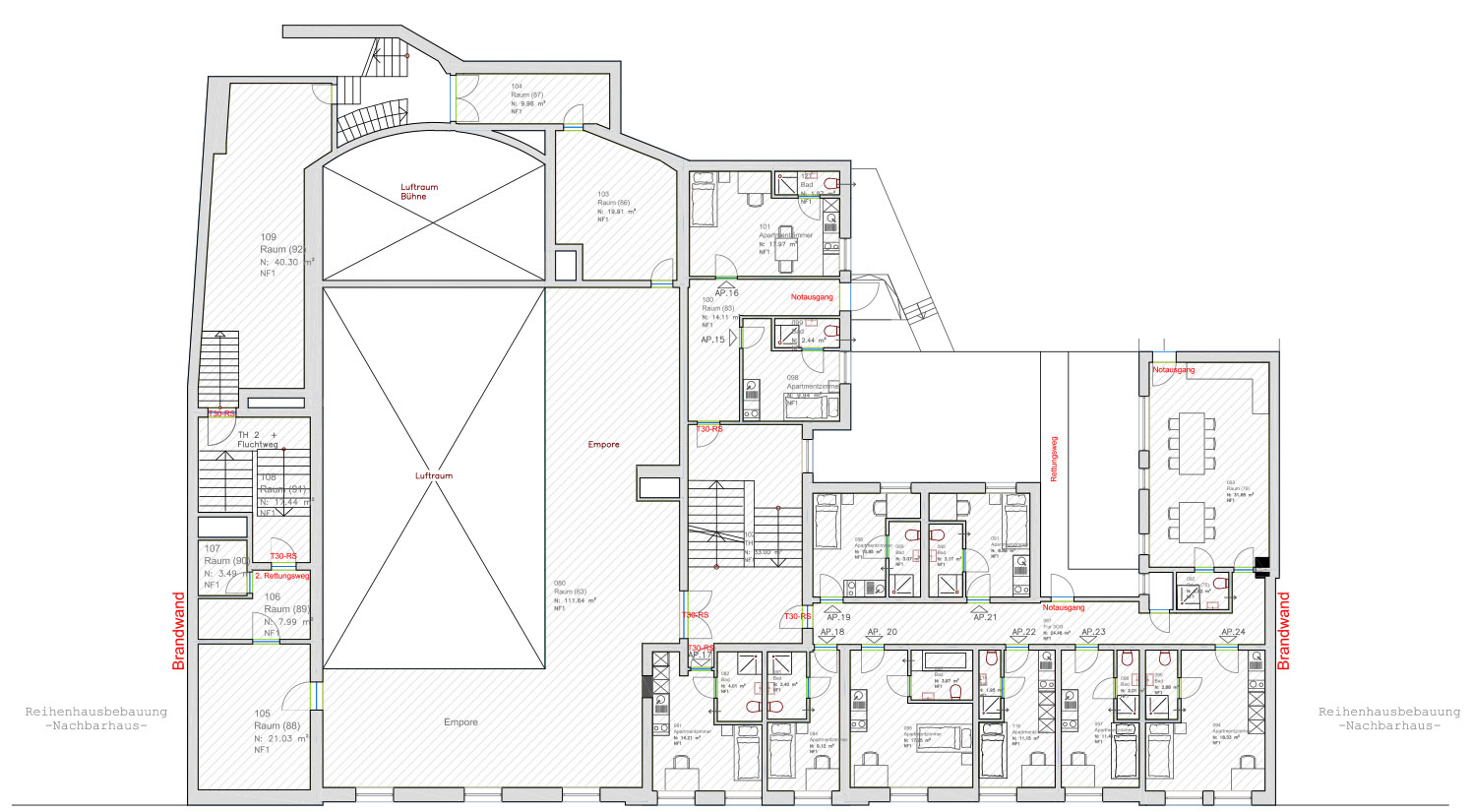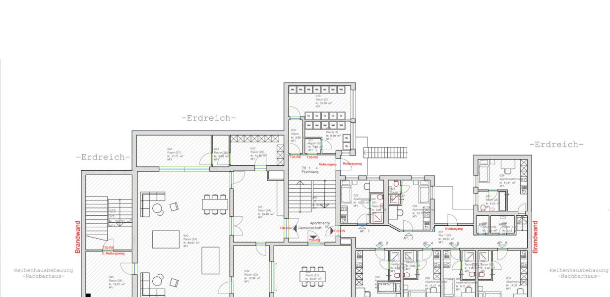 Auf der rechten Seite des Gebäudes erstrecken sich über das 1., das 2. und das 3. Obergeschoß insgesamt 30 Apartments mit einer Wohnfläche von 18 – 35 qm. Dieser Wohnbereich nimmt weitere 1.700 qm des Gebäudes in Anspruch. Die Apartments sind zweckmäßig geschnitten und werden an Langzeitmieter vermietet. Sie sind über einen separaten Zugang erreichbar und können losgelöst von den beiden anderen Bereich genutzt werden.