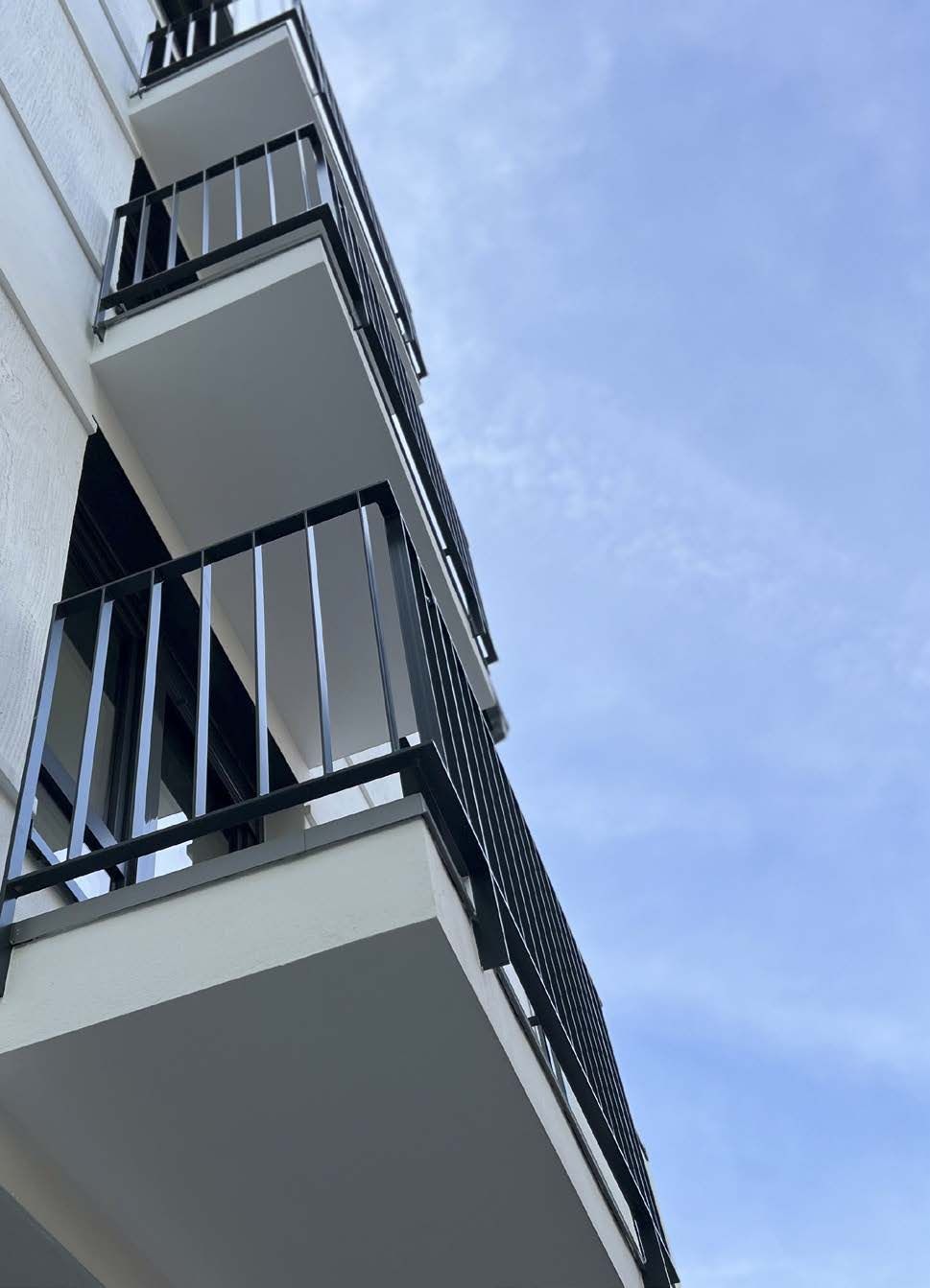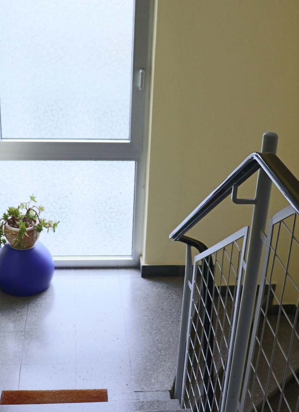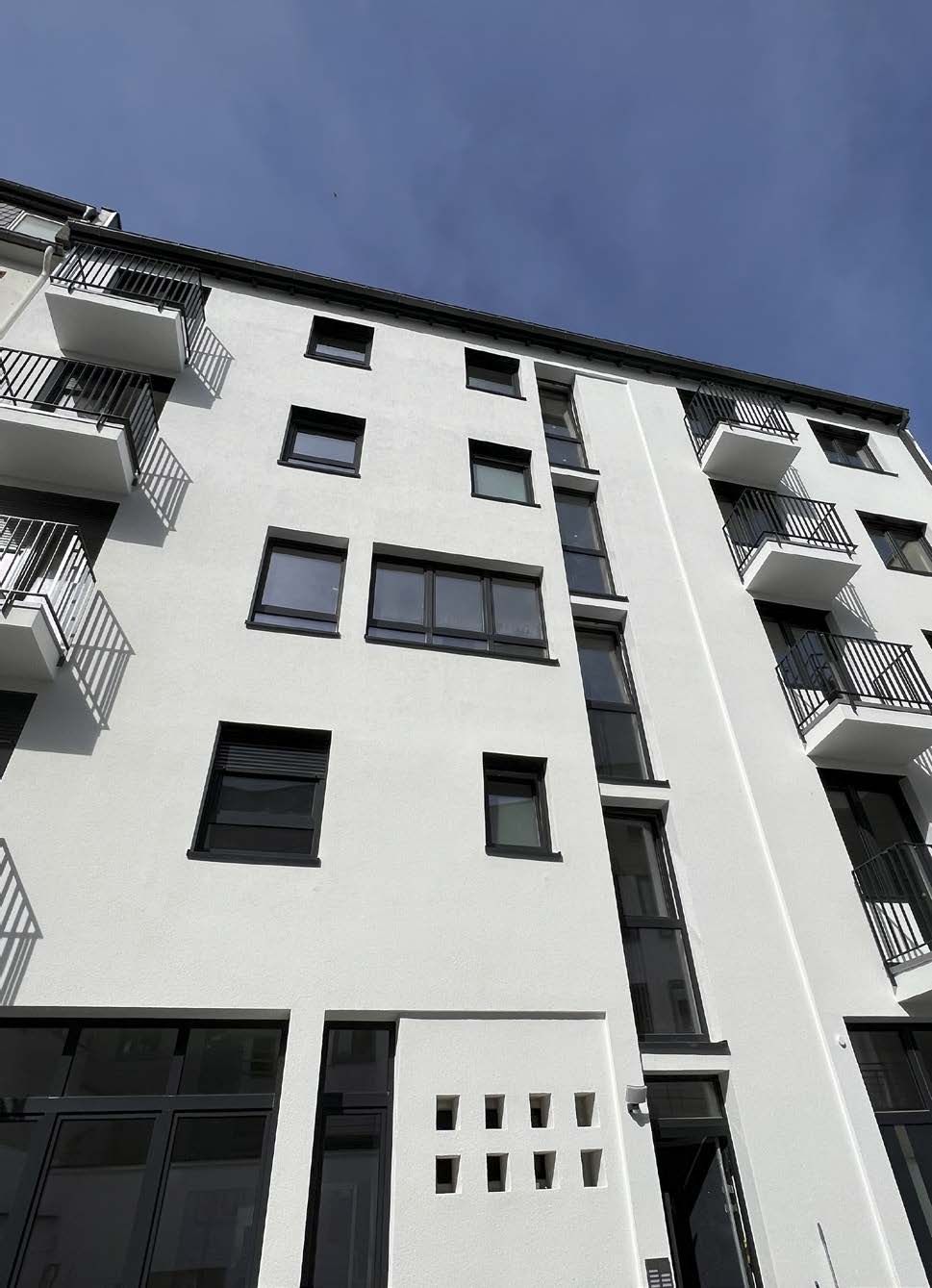 Die Fassade wurde mit 18cm-Mineralwolle gedämmt und mit einem aufwendigen Muster in handwerklich anspruchsvoller Besenstrich-Technik verputzt. Alle Balkone wurde energetisch ertüchtigt um Wärmebrücken zu vermeiden. Zuletzt wurde das gesamte Treppenhaus saniert und mit einem über alle Stockwerke verlaufendes Innengeländer ausgestattet.