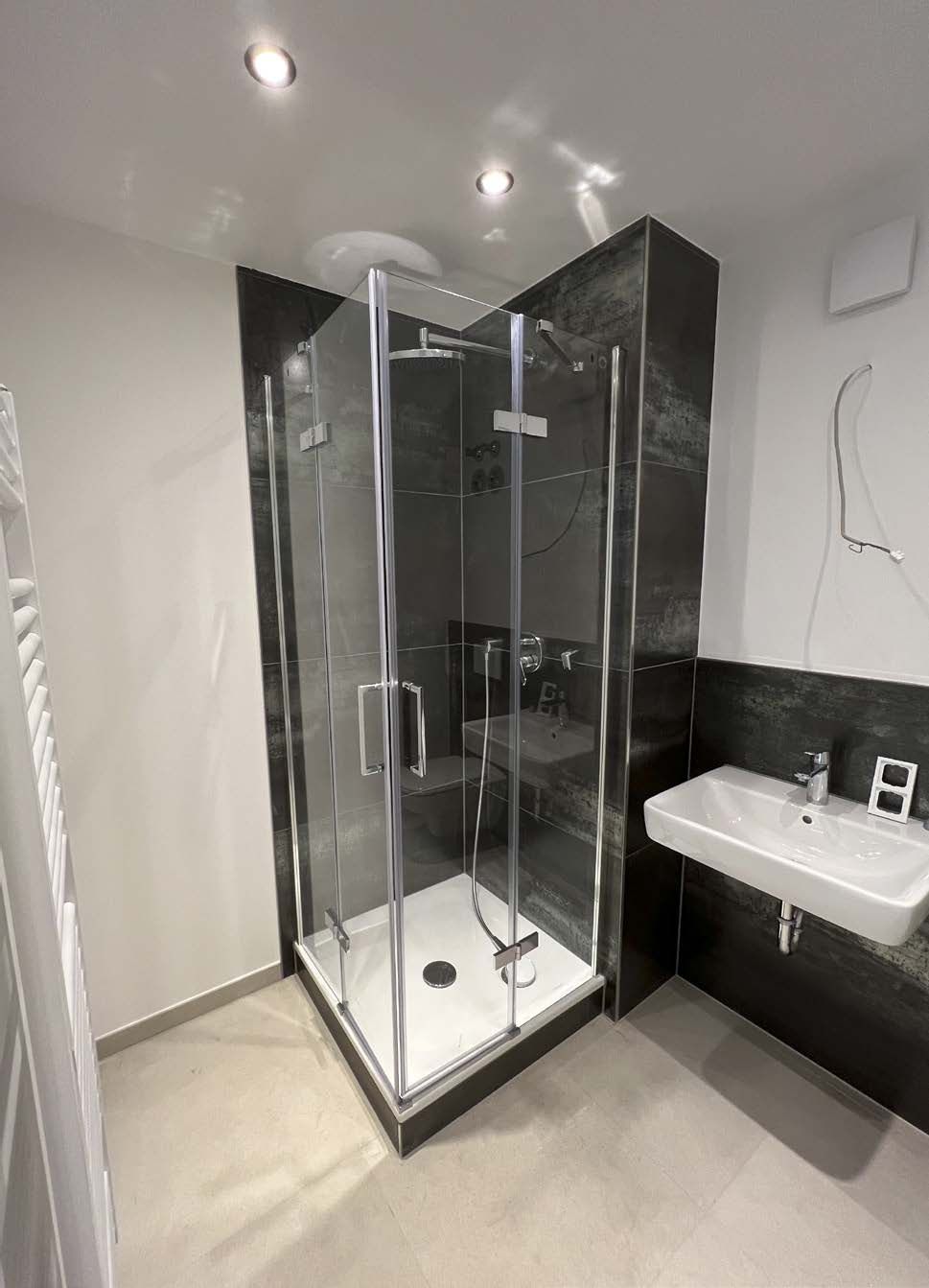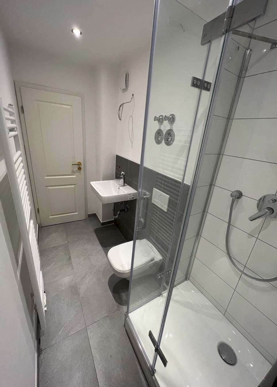 Parallel wurden in allen Wohnungen die Steigleitungen, die Fallrohre und die gesamte Strom- und Heizungsversorgung neu verlegt sowie eine hochmoderne Hybridanlage mit Wäremepumpe und Solaranlage installiert. Alle alten Fenster wurden durch energieeffiziente 3-fach-verglaste Fenster mit hohem Schalschutz-Standard ausgetauscht. Hierbei wurde penibel darauf geachet, dass sie mit hochwertigen Dichtungsbändern ausgestattet wurden. Die Bäder wurden aufwendig saniert und mit modernster Technik ausgestattet. Die alten Bodenbeläge wurden entfernt und durch moderne Parkettböden ersetzt.
